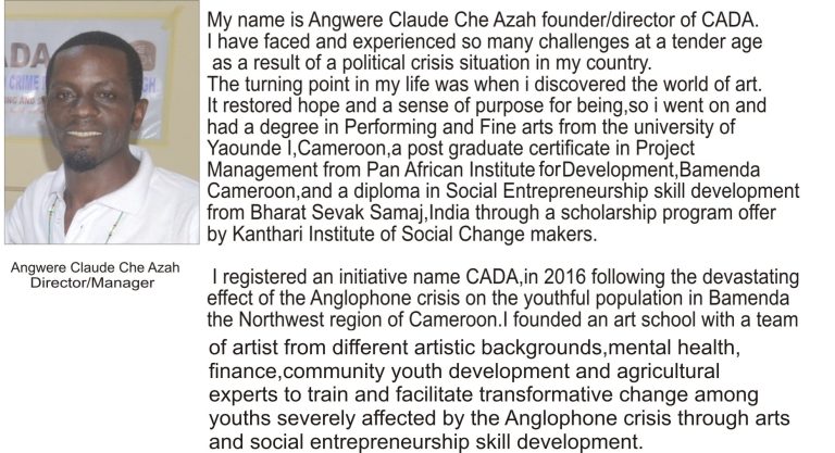 Collective Arts Development Association(CADA),is a development,humanitarian and non profit organization located in Nkwen Bamenda Northwest region of Cameroon.The organization was founded as a result of the negative effect of the Anglophone crisis on the youthful population in Bamenda,the Northwest region of Cameroon that is why it has as mission to transform the mindsets of disadvantaged youths (internally displaced,homeless and the vulnerable)through life skill education,art training and social entrepreneurship skill development.Our goal is to assist these youths to build resilience and to acquire marketable skills so to improve on their livelihoods.